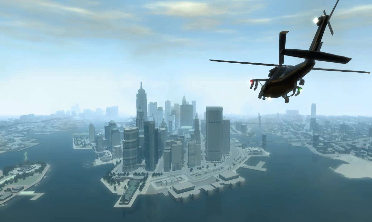 Liberty City: na środku screena Algonquin, z lewej strony widać Happiness Island, a w tle Alderney. Z prawej strony widać dzielnicę Broker